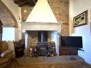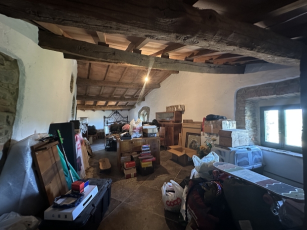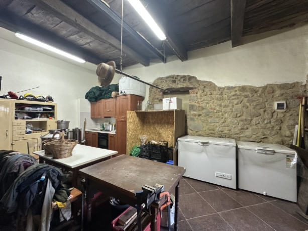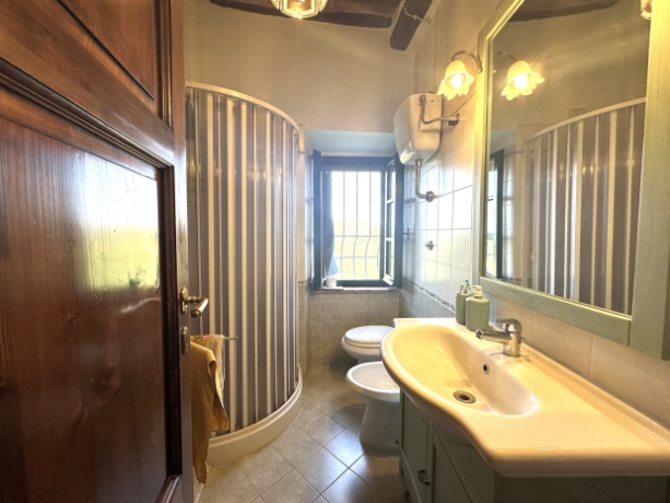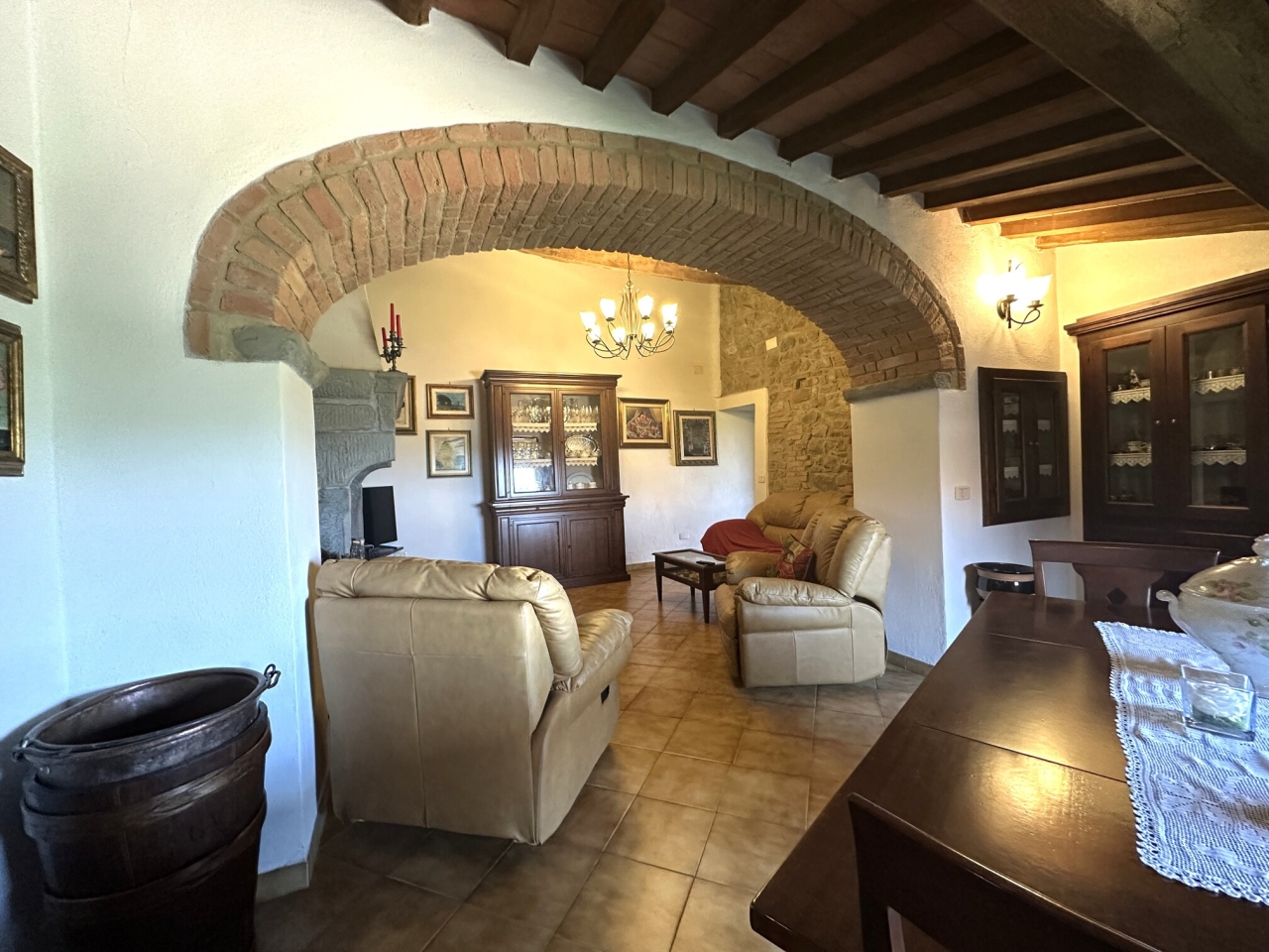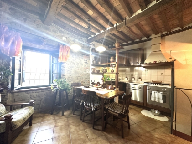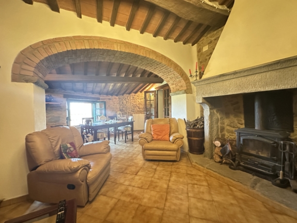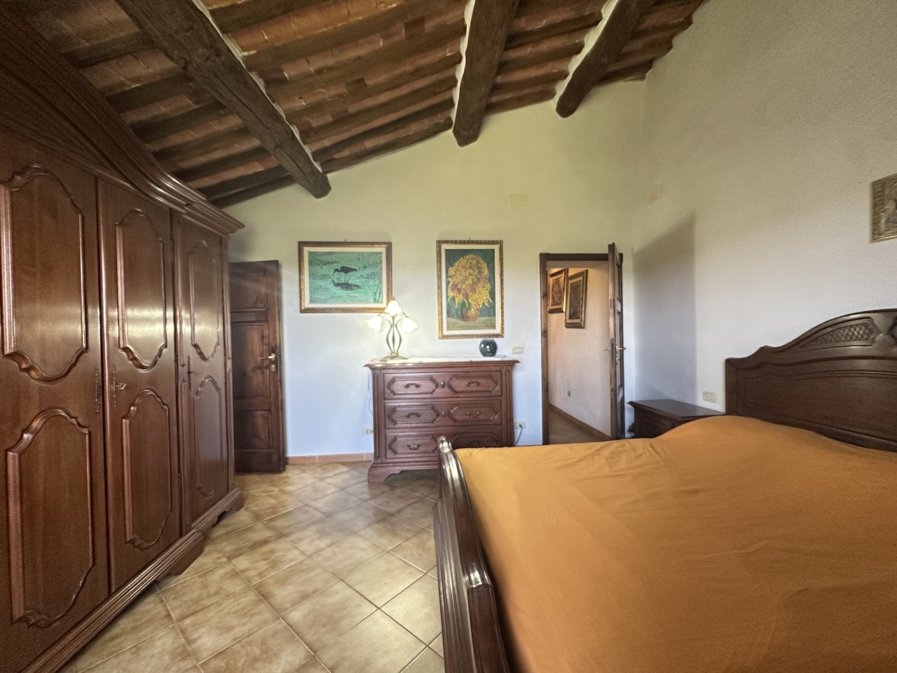 Salendo da una scala a chiocciola in ferro battuto entriamo nell’abitazione principale. Un’ampia cucina abitabile ci accoglie in una casa tipica toscana, con soffitti a travi in legno e qua e là pareti con pietra facciavista. Dalla cucina passiamo al grande soggiorno, suddiviso in zona pranzo e zona living. Qua domina, in tutto il suo splendore un grandissimo camino, che attualmente ospita una stufa in ghisa, ma che può essere facilmente ripristinato. Questo piano accoglie anche due camere da letto matrimoniali, di cui una padronale con bagno en suite ed un secondo bagno. Una scala in legno accompagna ad un piccolo attico, attualmente utilizzato come deposito, ma che potrebbe diventare una terza camera, oppure uno studio, avendo tra l’altro il suo ingresso vicino al portone principale.