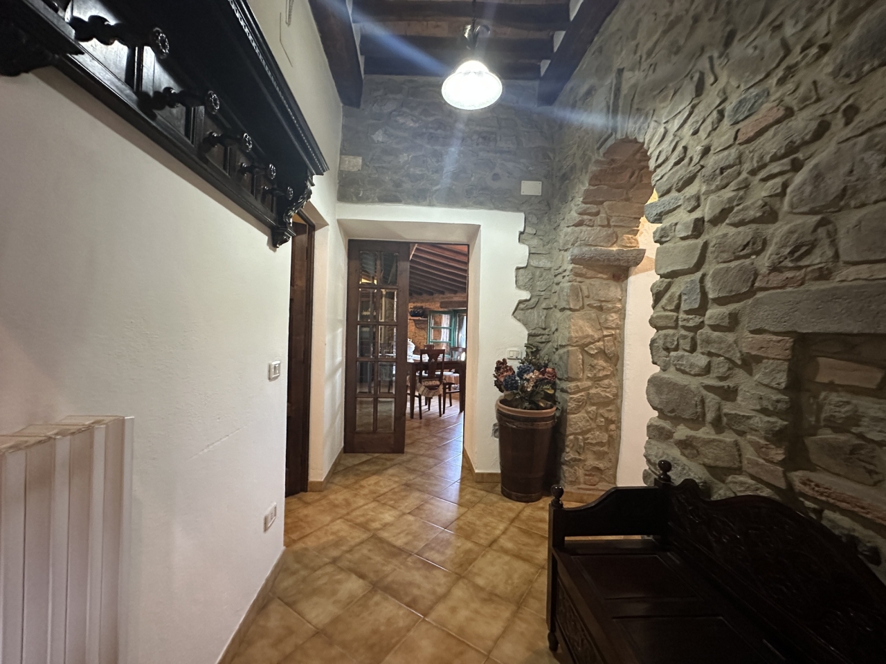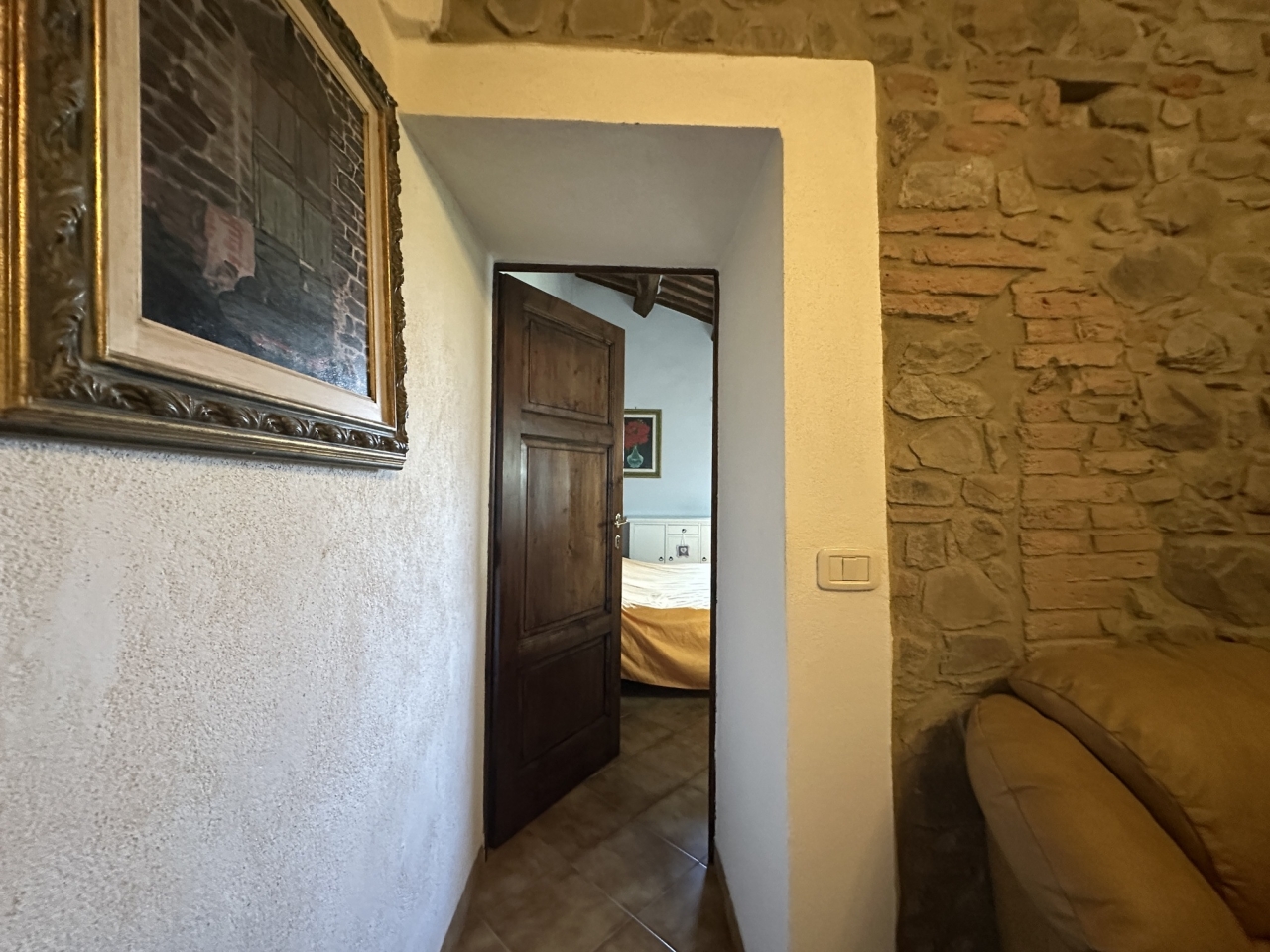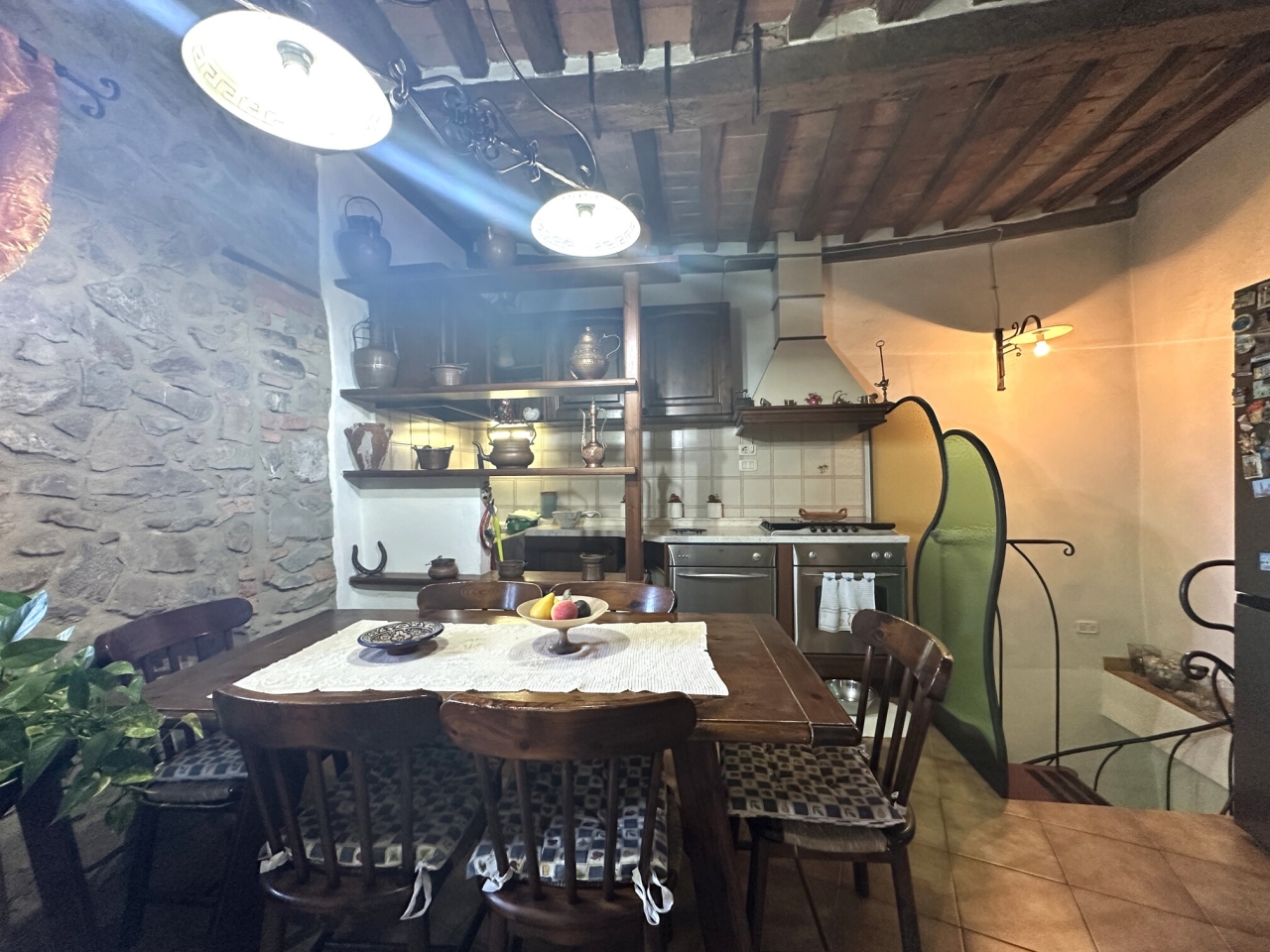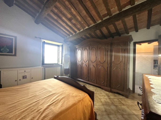 Salendo da una scala a chiocciola in ferro battuto entriamo nell’abitazione principale. Un’ampia cucina abitabile ci accoglie in una casa tipica toscana, con soffitti a travi in legno e qua e là pareti con pietra facciavista. Dalla cucina passiamo al grande soggiorno, suddiviso in zona pranzo e zona living. Qua domina, in tutto il suo splendore un grandissimo camino, che attualmente ospita una stufa in ghisa, ma che può essere facilmente ripristinato. Questo piano accoglie anche due camere da letto matrimoniali, di cui una padronale con bagno en suite ed un secondo bagno. Una scala in legno accompagna ad un piccolo attico, attualmente utilizzato come deposito, ma che potrebbe diventare una terza camera, oppure uno studio, avendo tra l’altro il suo ingresso vicino al portone principale.