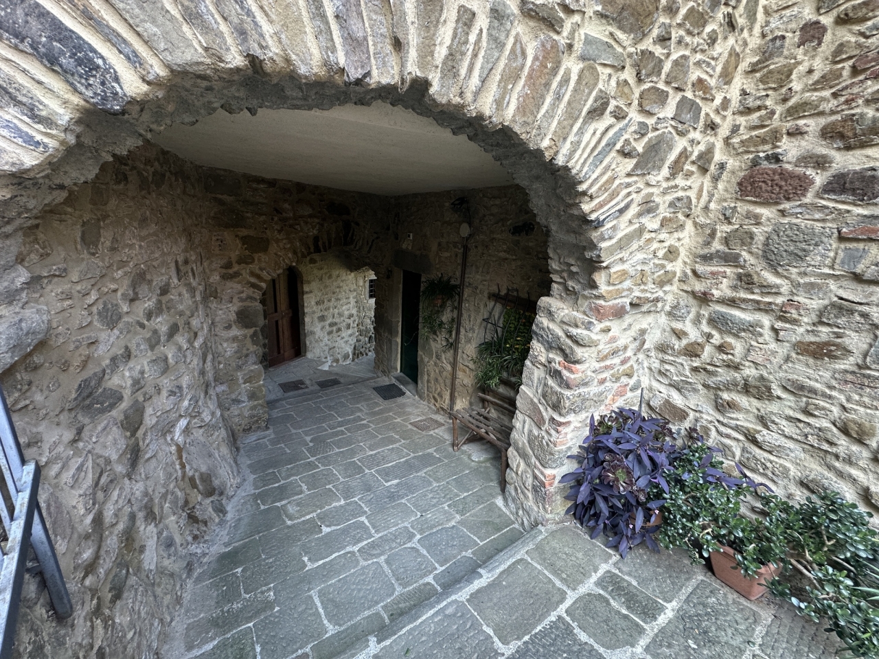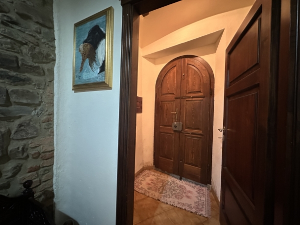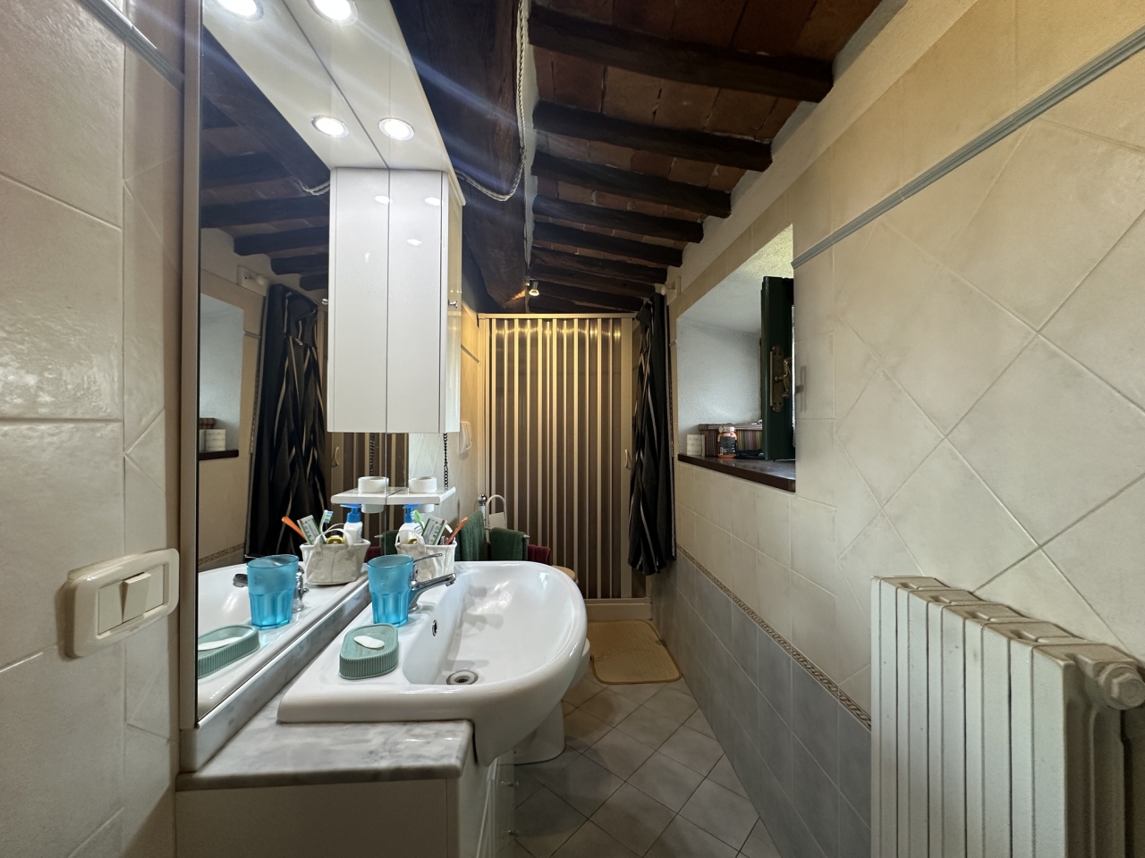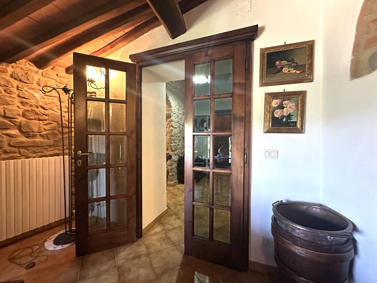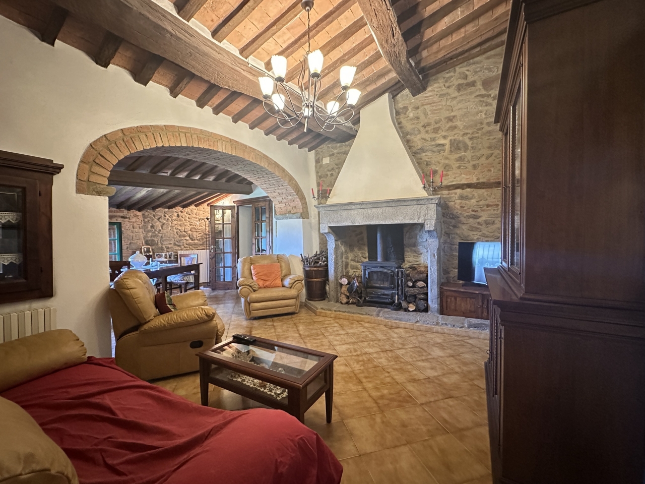 Salendo da una scala a chiocciola in ferro battuto entriamo nell’abitazione principale. Un’ampia cucina abitabile ci accoglie in una casa tipica toscana, con soffitti a travi in legno e qua e là pareti con pietra facciavista. Dalla cucina passiamo al grande soggiorno, suddiviso in zona pranzo e zona living. Qua domina, in tutto il suo splendore un grandissimo camino, che attualmente ospita una stufa in ghisa, ma che può essere facilmente ripristinato. Questo piano accoglie anche due camere da letto matrimoniali, di cui una padronale con bagno en suite ed un secondo bagno. Una scala in legno accompagna ad un piccolo attico, attualmente utilizzato come deposito, ma che potrebbe diventare una terza camera, oppure uno studio, avendo tra l’altro il suo ingresso vicino al portone principale.
